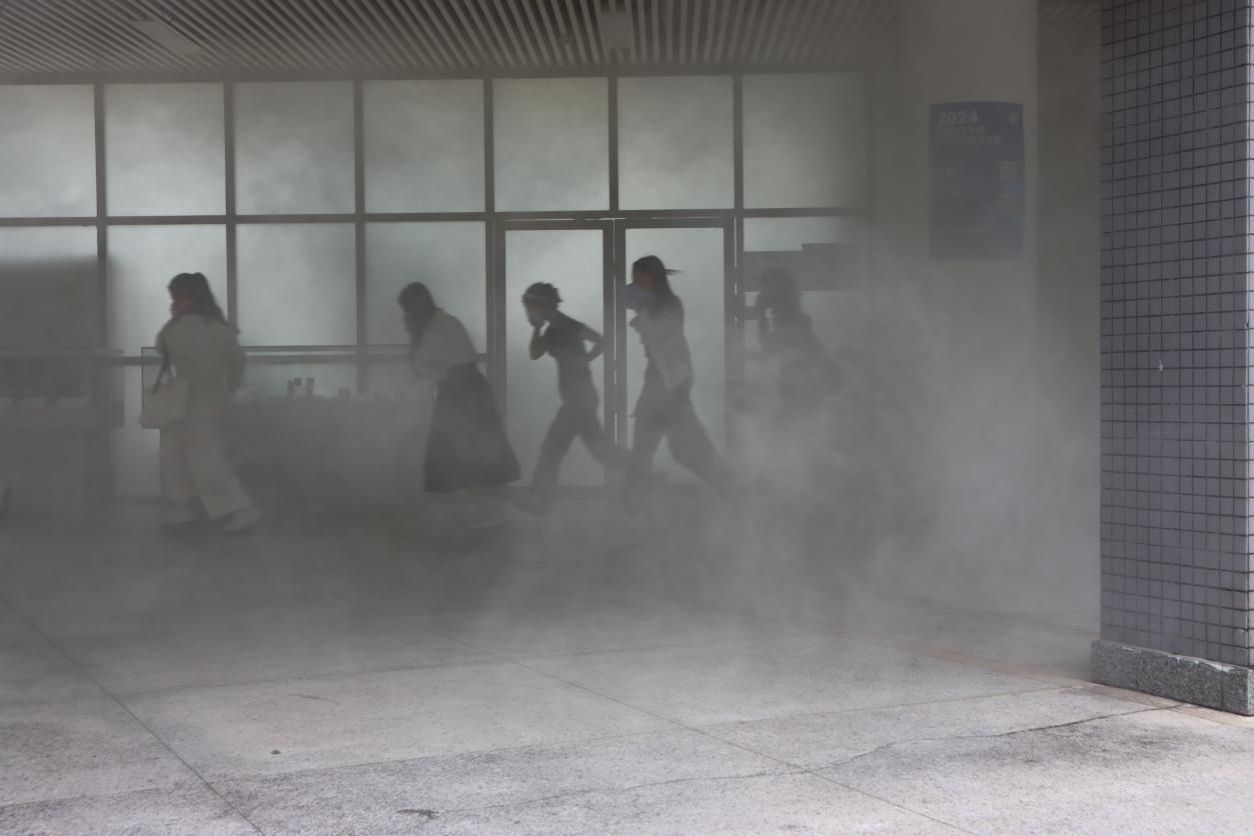 进入实操环节,研一研究生被分为两个小组。第一小组在祝铭韩老师和班长白小玉的引领下前往二楼实验室,第二小组在王蓉蓉老师和班长周波的带领下前往三楼实验室。警报响起,各组带队老师沉着冷静地组织学生按照指定路线迅速有序撤离,安全抵达广场集合点并清点人数。