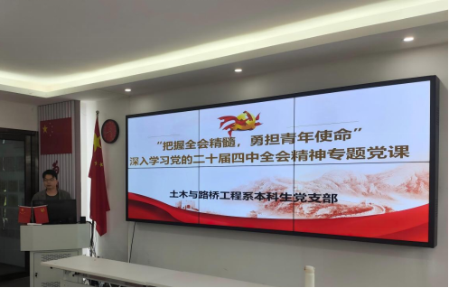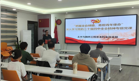 为深入学习贯彻党的二十届四中全会精神,引导支部党员深刻领会全会核心要义,增强政治自觉与行动自觉,切实引导青年学生党员将个人理想融入国家发展大局。支部书记苏朗以 “把握全会精髓,勇担青年使命”为题,为支部全体党员授课,推动全会精神在青年群体中落地生根、入脑入心。
