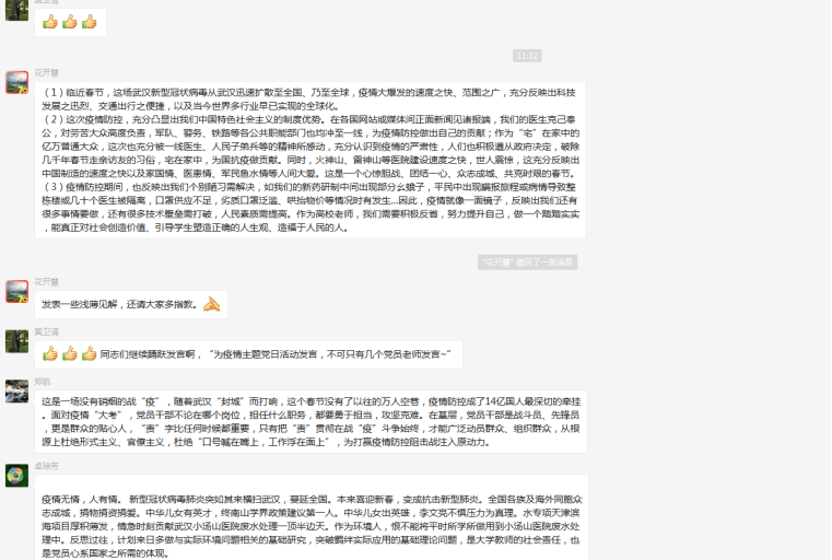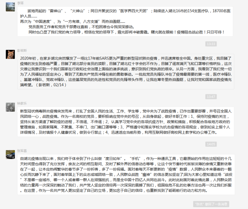接下来接下来张敏同志发表了在疫情期间,作为一名大学老师,如何看待自己的职责。她表示1、要及时将学校关于新型冠状病毒肺炎疫情防控工作的通知精神传达给学生,并通过电话、微信、QQ等各种方式及时准确掌握学生的假期动向和身体状况,督促学生配合学校做好健康日报工作。 2、引导学生理性科学地看待疫情,通过官方权威途径获取信息和防控知识,不造谣、不信谣、不传谣,不在网络上发布未经证实的相关信息,消除焦虑、恐慌情绪。 3、随着战“疫”时间增长,开学时间迫不得已会延长,教育部通知要“停学不停课”,我们要充分利用线上的慕课和省、校两级优质在线课程教学资源,依托各级各类在线课程平台、校内网络学习空间等,加强学习,提升教学技能,积极开展在线教学活动,保证疫情防控期间教学进度和教学质量。吕小梅老师表示我们共同经历了种种复杂心情。疫情仍在持续蔓延,但不时也会有好消息:每日新增病例正在减少,疫苗研发逐步推进,病毒菌株成功分离,各地救援团队驰援武汉,治愈病例不断增多,防控物资进入绿色通道,等等。对于我们普通人,我们需要保持信心,做好防护,相信科学,相信国家,斥责谣言、坚持在家不出门、不添乱,就能为抗击疫情做出的贡献。第一声春雷已炸响,武汉的春天、湖北的春天、祖国的春天马上就会到来,让我们共同期待春暖花开。群里的各位党员都积极发表了自己在国家这个特殊时期的心情,对武汉同胞的关切,对党的信任和战胜疫情的强大决心。