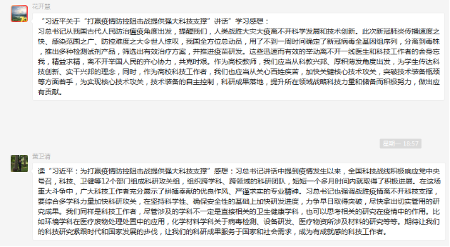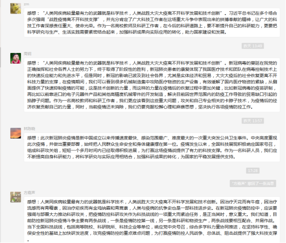 2019年底武汉爆发的新冠肺炎疫情是新中国成立以来在我国发生的传播速度最快、感染范围最广、防控难度最大的一次重大突发公共卫生事件。抓住科技创新就抓住了发展全局的关键,这在这场疫情防控阻击战中体现得尤为深刻。我们支部本月主题党日活动的形式是政治学习。主题是“习近平关于打赢疫情防控阻击战提供强大科技支撑讲话”。支部党员老师认真讲话内容,并在微信群上发表感言。