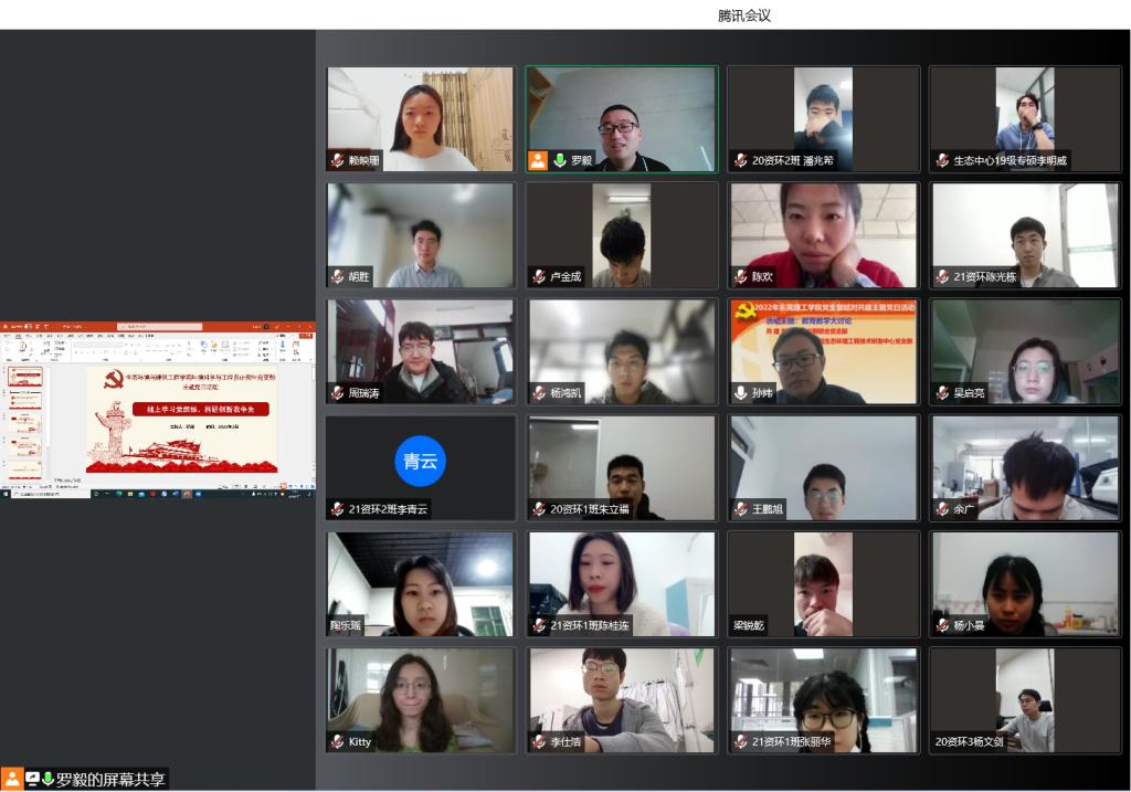 环境科学与工程系研究生党支部召开线上主题党日活动,由党支部书记罗毅主持召开,研究生党支部所有同志参与主题党日活动。本次活动主要围绕“线上学习党旗扬,科研创新我争先 ”讨论疫情防控条件下如何做好线上学习和科研工作。