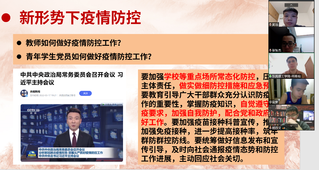 何春灿同志、庞书孟同志作为教师党员,认真分析了线上上课的利弊,并表示以后会更加注重线上上课的质量,给学生做良好的示范。杨程育同志,曾凯城同志等作为学生党员代表,也表达了自己对线上上课的看法,简述了线上上课的优缺点,并表示自己以后会严格要求自己,提高上课学习的效率。