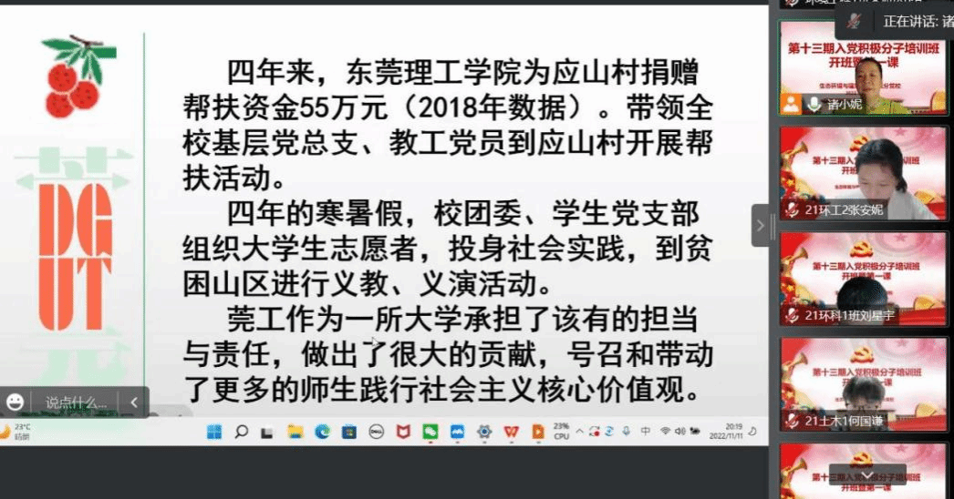 党委通过线上平台开展分党校第十三期入党积极分子培训班开班暨第一课。本次培训班由学院党委副书记诸小妮老师主讲,第十三期入党积极分子培训班全体入党积极分子参与。
