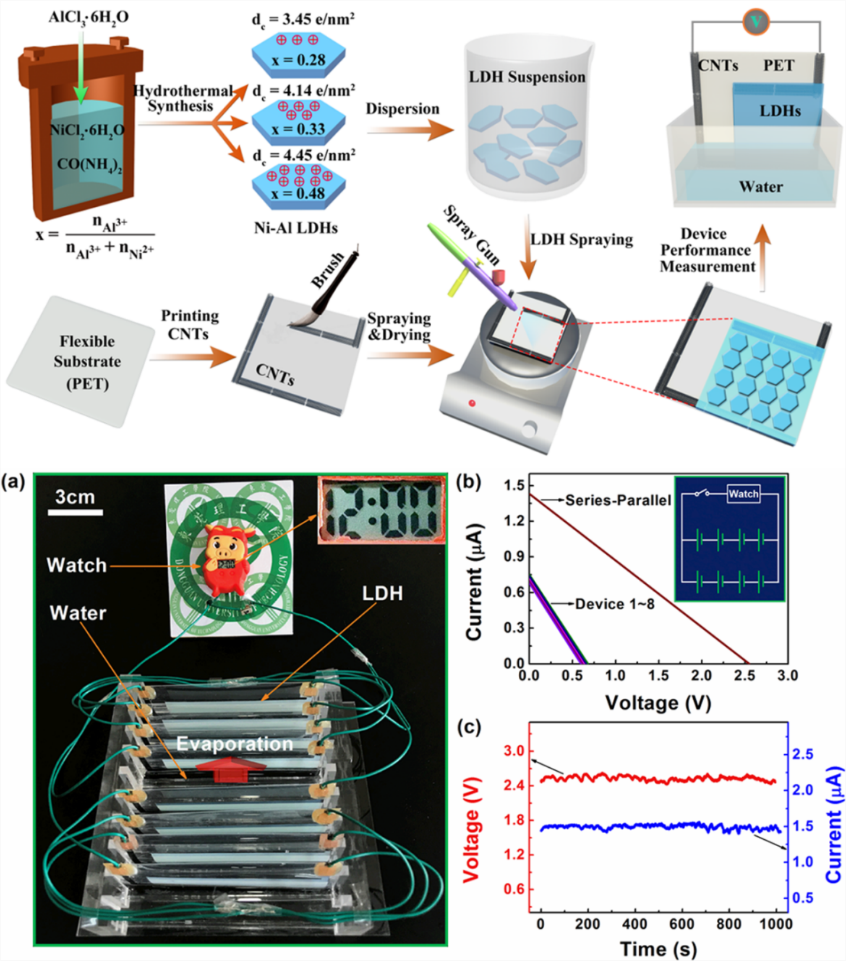 田吉利博士后(合作导师曲江英和梁工英教授)以影响水蒸发驱动微流体发电的一个关键因素—材料表面电荷密度为切入点,精确调控Ni-Al LDHs表面电荷密度,在PET表面组装了具有高稳定性的柔性水蒸发驱动微流体发电机,首次系统研究了不同表面电荷密度对器件发电性能的影响。在此基础上,通过优化器件的结构和组装方式,利用水蒸发发电成功驱动一个儿童手表正常工作,如图所示(Nano Energy, 2020, 70: 104502,第一单位,通讯作者为曲江英教授和高峰副教授)。该成果是课题组前期工作的深化研究,前期以层状双金属氢氧化物(LDHs)为发电材料,成功构筑了水蒸发驱动的柔性发动机,实现了水蒸发能转化为电能(Nano Energy,2019, 57: 269,第二单位)。