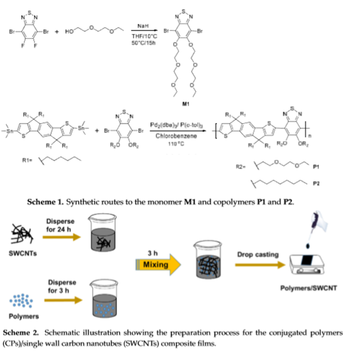 该成果通过向共轭聚合物骨架引入极性侧链的策略,构筑了新型共轭聚合物/碳纳米管复合热电材料,极性侧链的引入提高了聚合物与碳纳米管之间的界面相互作用力,有利于载流子的传输,因此表现出比含烷基侧链共轭聚合物/碳纳米管复合材料更高的功率因子。该研究的开展可以为聚合物/碳纳米管复合材料体系的构筑提供新的思路和方法。