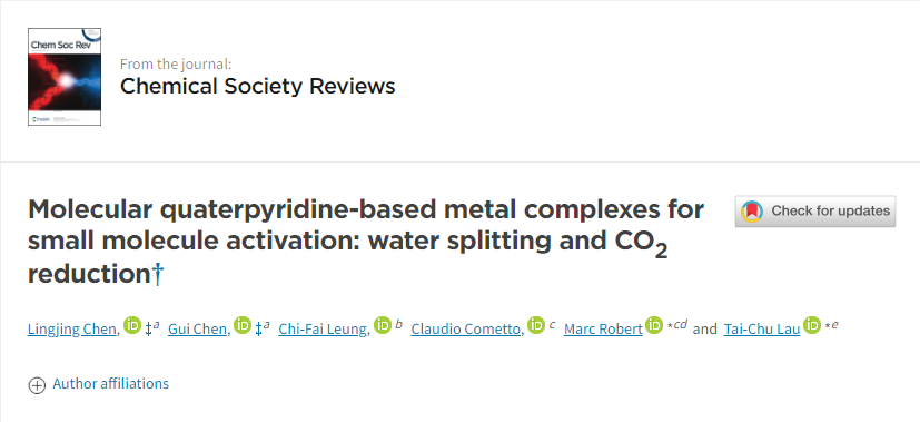 2020年9月,陈灵晶、陈贵博士与香港城市大学刘大铸教授和法国巴黎大学MarcRobert教授合作在国际顶级期刊《Chemical Society Reviews》上发表综述论文。《Chemical Society Reviews》是英国皇家化学会发行的一本国际顶级期刊,影响因子42.8。该成果以anime1