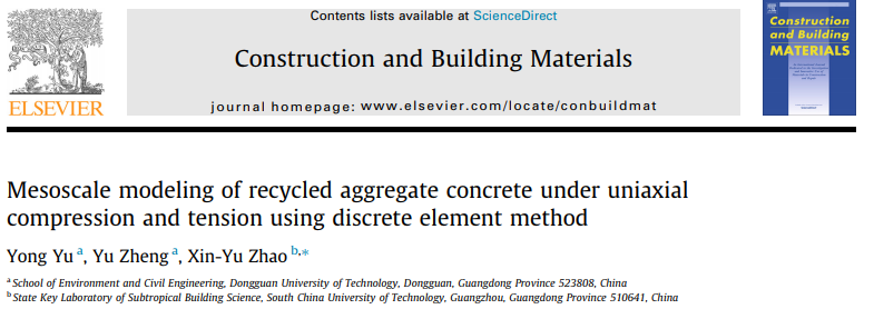 余勇博士后、郑愚教授及华南理工大学赵新宇副教授联合在国际权威杂志《Construction and Building Materials》上发表了题为“Mesoscale modeling of recycled aggregate concrete under uniaxial compression and tension using discrete element method”的SCI论文。