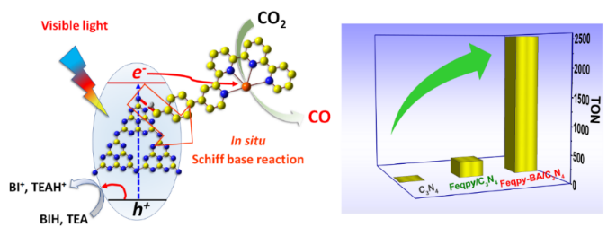 有鉴于此,我们采用C3N4作为光敏剂,苯甲醛基修饰的四联吡啶铁基配合物为催化活性组分,利用席夫碱反应实现分子催化剂与C3N4在光催化过程的原位共价键连。该共价键的构筑不仅提供强韧的光电子传输通道、提高光电子利用率,且有效抑制HER竞争反应,实现了高活性、高选择性的光催化CO2还原过程。基于该催化体系,CO转化数可达2554,为非共价键连体系的10倍之高,同时CO选择性可达95%,优于以往报道的各类非共价键连复合催化体系。该工作表明原位共价键连策略可有效提升复合体系催化性能,为构筑新型分子配合物-半导体复合催化剂用于其他高效光催化反应提供了重要思路。