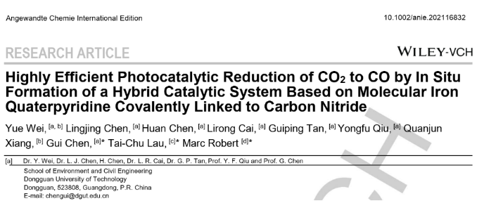 为第一单位,在国际顶级期刊《Angewandte Chemie International Edition》上发表题为“Highly Efficient Photocatalytic Reduction of CO2 to CO by In Situ Formation of a Hybrid Catalytic System Based on Molecular Iron Quaterpyridine Covalently Linked to Carbon Nitride”的学术论文。这是以我校为第一单位发表在《Angewandte Chemie International Edition》上的第一篇学术论文。《Angewandte Chemie International Edition》影响因子15.3,属于中科院一区顶级期刊,也是我校认定的T2类权威期刊。在该工作的基础上,魏曰博士后还成功申请到2021年度广东省基础与应用基础研究青年基金项目。魏曰博士后合作导师为邱永福教授和陈贵教授。