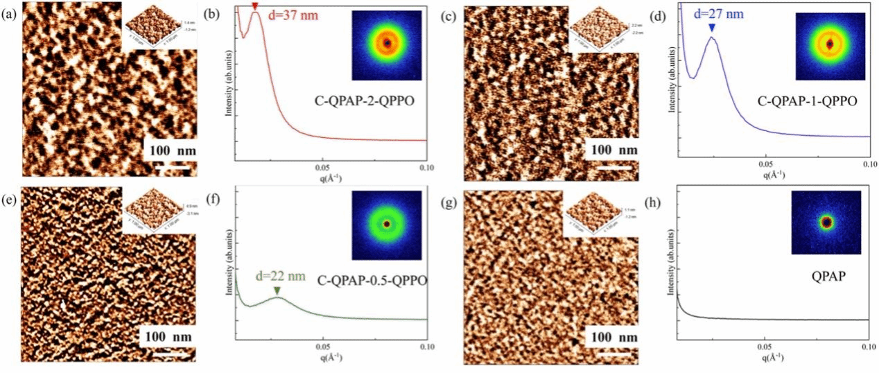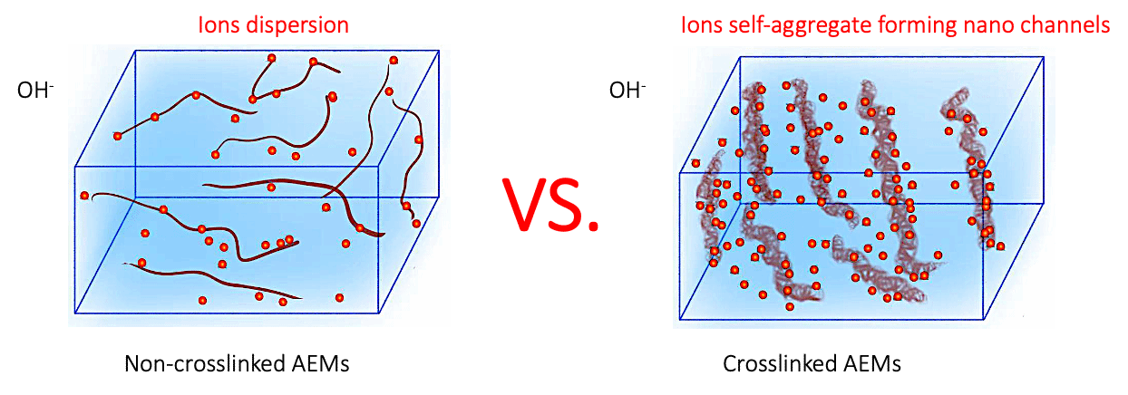 阴离子交换膜(AEMs)在AEMWE中扮演着至关重要的角色,然而,AEMs的离子电导率和尺寸稳定性之间难以平衡仍是制约高性能电解水制氢技术发展的关键因素。针对上述问题,本研究利用部分功能化的聚苯醚作为大分子交联剂,制备了新型交联型AEMs。由于交联结构的存在,交联型AEMs的溶胀率远低于非交联型膜。在80 °C时表现出高达139.4 mS cm-1的离子电导率,这归因于其良好的微相分离结构。此外,该膜还具有出色的碱性耐久性,在60 °C的1 M KOH中经过2400小时后仍保持了86%以上的离子电导率。将膜组装到电解槽,在80 °C(2.0 V)下实现了最大电流密度1440 mA cm-2。这些研究结果表明本研究设计的阴离子交换膜材料在电解水技术中的潜在应用前景。