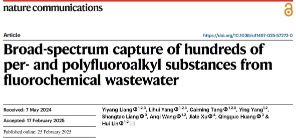 2025年2月25日-26日,林辉教授团队先后在Nature Communications和环境领域旗舰刊Environmental Science & Technology 发表了题为“Broad-spectrum Capture of Hundreds of Per- and Polyfluoroalkyl Substances from Fluorochemical Wastewater”和“Durable Ti4O7 Heterojunction Composite Membrane Encapsulating N-Doped Graphene Nanosheets for Efficient Electro-Oxidation of GenX and Other PFAS in Fluorochemical Wastewater”的研究论文。2024届硕士研究生梁逸扬为两篇论文的第一作者,杨立辉博士、唐才明博士及王安祺博士分别为共同第一作者,林辉博士为独立通讯作者,anime1 为唯一通讯单位。