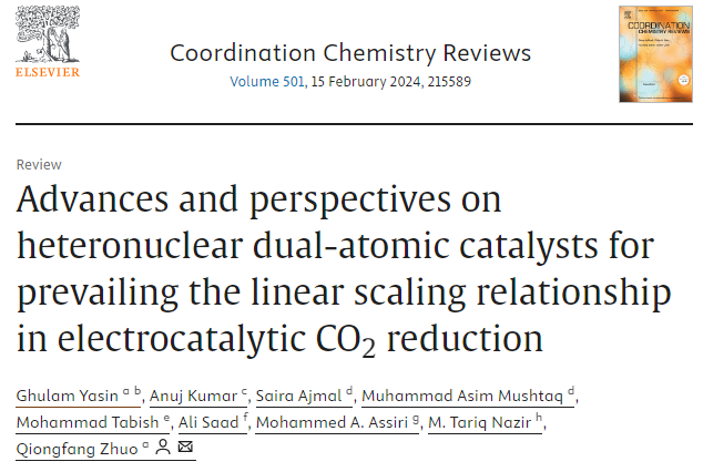 此外,Ghulam Yasin博士于2024年2月15日在国际权威期刊《Coordination Chemistry Reviews》(2024-2025最新影响因子: 23.5)发表综述文章“Advances and perspectives on heteronuclear dual-atomic catalysts for prevailing the linear scaling relationship in electrocatalytic CO2 reduction”。我校 Ghulam Yasin 博士为文章第一作者,卓琼芳博士为通讯作者,anime1