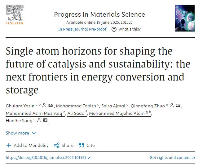 博士后 Ghulam Yasin 博士在国际权威期刊《Progress in Materials Science》(2024-2025最新影响因子: 40)发表综述文章“Single atom horizons for shaping the future of catalysis and sustainability: the next frontiers in energy conversion and storage”。我校Ghulam Yasin博士为文章第一作者,卓琼芳博士为共同通讯作者,anime1