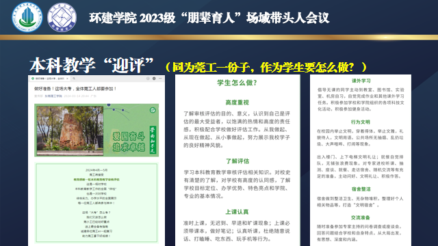 本次会议还对假期出行及在校安全、近期教务事宜、党团联建活动、学生社区管理、外出请假审批、心理健康普测、常见传染病处置,突发事件联系、医保及校方险和意外险等方面释疑解惑,对近期各班级工作上遇到的问题进行了一一交流。
