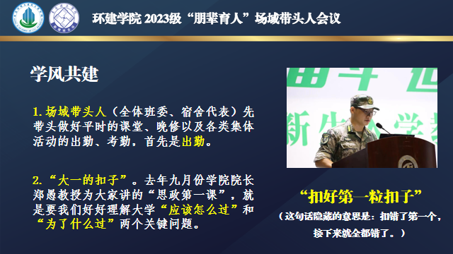 本次会议是“班级”“课堂”“宿舍”各场域带头人新学期开学后的第一次见面,会议从李春志老师概述本年级上一学期在校情况和新学期第一个月在校情况为开端,“复盘”过往,敦促同学们在思想和行动上“整装再出发”。会上,李春志老师强调,在座各位同学都是既带着自身的责任,也同时带着集体的责任,尤其是带着自己所在场域的责任;在座170余人就是整个年级的50%,整个年级需要靠大家去影响和带动,需要大家在班级里、在课堂上、在宿舍里、在集体活动中,尤其在作为一名大学生的主职主业上,也就是首先在学习上,必须带好头,同时做好带头的工作。