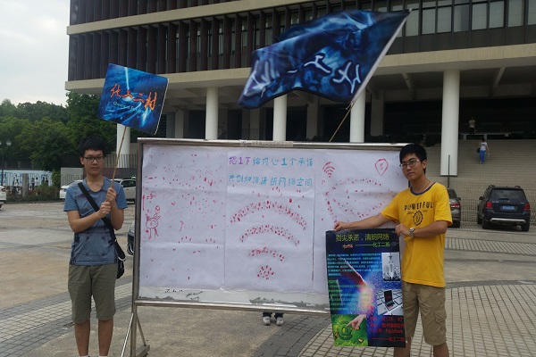 在活动开始后,宣传组向团员派发宣传单,让团员了解到本次的活动内容。每当有团员走到活动处,团干会给他们对活动内容进行进一步的讲解即扫二维码关注本支部的微信平台并将此次活动分享到朋友圈的人,就可以获得一张明信片。最后,执行组引领团员们来到手印墙前,说明一番后,团员自愿摁下手印承诺成为网络文明志愿者。指尖承诺,共同抵制不良网络的危害。在活动进行到尾声也有集满十八个赞的团员,领取到精美礼品。