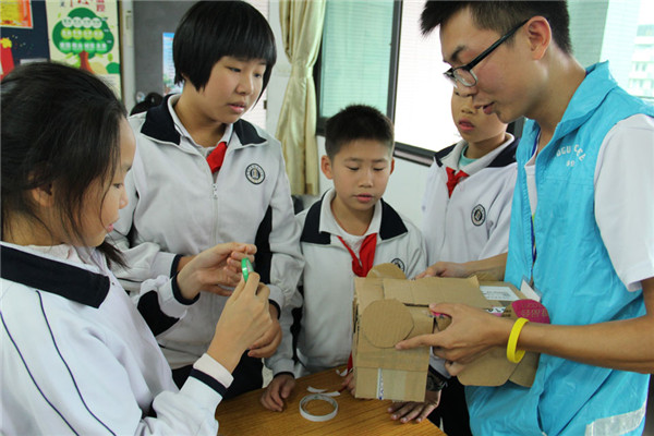 首先,由14届队员曾美影向小学生讲解生活废旧物品的回收与利用,授课过程中该队员与同学们积极互动,并以举手抢答方式激起学生的兴趣。授课环节后,由14届全体队员一边向学生展示用废旧物品做的小工艺作品一边讲解工艺品的制作过程,让他们感受废旧物品是如何变身为漂亮的工艺品,从而提高他们的创作兴趣。此后让学生们自主选择主题,完成好分组后,队员们派发废纸盒,塑料瓶,废旧衣物,宣传单等生活废旧物品给小组,并协助学生们顺利安全地完成一次自主手工制作工艺品。制作完成后,由队长评选出最好的作品进行评奖和展示。手工工艺品制作的环节让小学生的动脑能力和动手能力得到了提升,同时通过跟组员的合作也培养他们的团队意识。