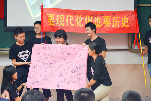 激动人心的颁奖环节到了,班主任刘啸天老师、朱杰老师和辅导员陈泳源老师分别上台为获得一等奖、二等奖以及三等奖的团支部颁奖。团总支副书记梁君健则上台为在本次活动中表现优秀的积极分子颁奖。最后全体起立合唱团歌,大会至此圆满落幕。
