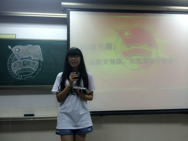 首先,主持人对中国梦进行了阐述,而后切入“亚健康”主题,对现场进行了“亚健康”心理健康问卷调查,且以PPT的形式将“亚健康”的概念及症状展现给大家,为大家普及“亚健康”知识。然后,其通过观看小视频用事例说明了“亚健康”症状积累造成的严重后果,警醒团员们远离亚健康,呼吁保持身心健康,共筑青春中国梦。