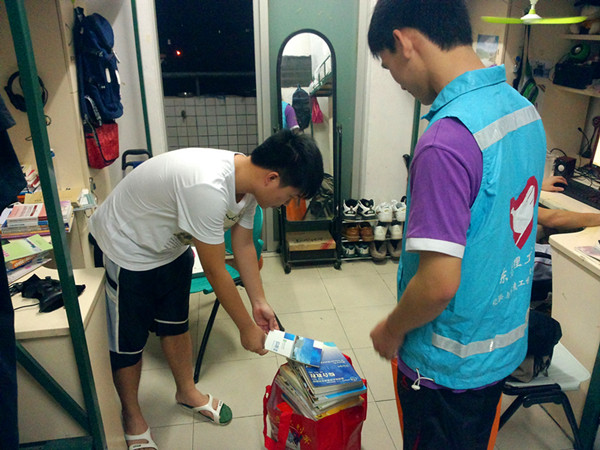 5月4日晚7点30分,志愿者集合完毕,负责人按照原定的分组方式将志愿者分为了若干小组,再分派到各栋宿舍楼收集回收二手书籍,活动得到了很多热心同学的支持,他们纷纷表示组织这样的回收活动不仅解决了他们处置废置教材的问题,支持了环保事业,还为下一届的同学提供了方便,这可谓是一举多得的活动。经过了志愿者的辛勤劳动,这次活动收集到了很多有回收意义的教材,过后,志愿者们将会协助UTBOOK把书本分类并录入信息。