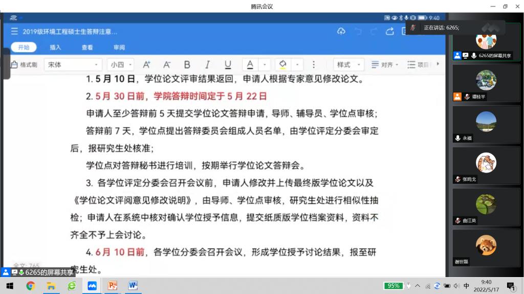 2022年5月17日,anime1 举行了2019级环境工程专业硕士研究生毕业答辩动员会。anime1 副院长邱永福教授和谭桂平副教授,研究生处宋雪晶博士和胡旖冉博士,及2019级研究生参加此次会议。邱永福副院长首先介绍了硕士研究生学位论文答辩基本程序与注意事项,张文涛老师详细讲解了硕士学位论文答辩与学位申请所需的材料清单及其填写要求,宋雪晶博士对毕业答辩要求进行了相关补充,并预祝此次答辩会顺利进行。