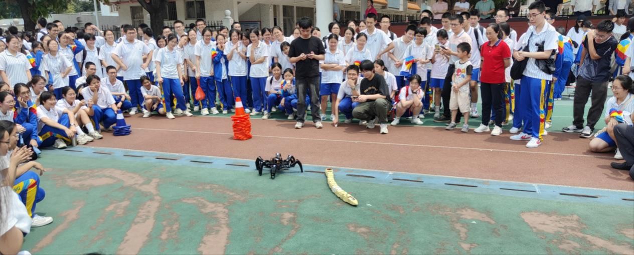 随后,招生宣传小组抵达新会一中,参与了该校的年度科技文化节活动。宋加雷博士带领学生团队,在科技文化节上展示了他们研发的仿生机器人。这些机器人凭借其创新的技术和独特的设计,吸引了众多师生的目光,并引发了热烈的讨论。