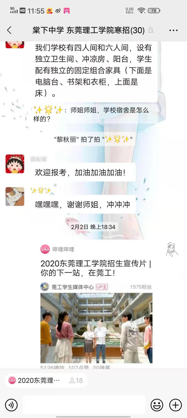 寒招队员线上发送视频等相关资料,向学子们介绍学校的基本情况,包括学校的地理位置,建设现状,学科专业,师资力量,科研情况等。同时也对家长关心的人才培养模式,毕业后的就业前景,广东省的招生政策和我校今年的招生新变化进行详细地讲解。在宣传过程中,寒招队员耐心解答考生们关心专业和社团活动的问题。学子们通过寒招队员的讲解和答疑,对anime1