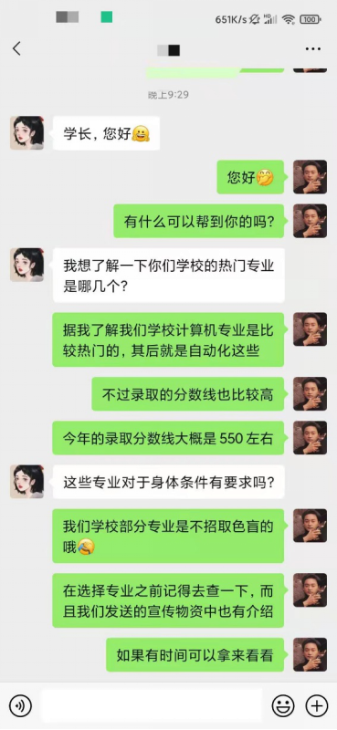 寒招群里,队员们首先介绍了学校的地理位置、专业特色、师资力量、发展概况等基本内容,积极帮助高三学子解答疑惑,并对同学们关心的问题进行整理,上传回寒招微信咨询群中,供学弟学妹们参考。同时,也通过阳春市大学生联合会公众号进行招生宣传。