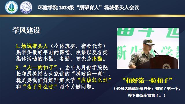带头人会议,始于面向新生助班的学工思政培训,目前参会群体已扩展至新生班委、宿舍代表、入党积极分子,人数超170人,占23级全体的50%。与会同学是既带着自身的责任,也同时带着集体的责任,尤其是带着自己所在场域的责任;年级整体依靠“带头人”影响和带动,就是回归依靠学生发展的自主能力;引导学生骨干在班级、宿舍、课堂、活动等场域带好头,尤其是在作为一名大学生的主职主业——学习上,必须带好头,才能做好带头的工作。场域带头人重视自身角色在当中的重要影响,才能加强对自身定位的认知、对班级职能的认知,以及对所在学院运作的认知,乃至对所在校园系统性的基本认知,从而使自身清楚有能力、有责任影响和带动身边同学进一步了解学院、了解校园、了解大学,而这恰恰是共同构建大学生对学校、对大学的认同感和归属感的重要体现。
