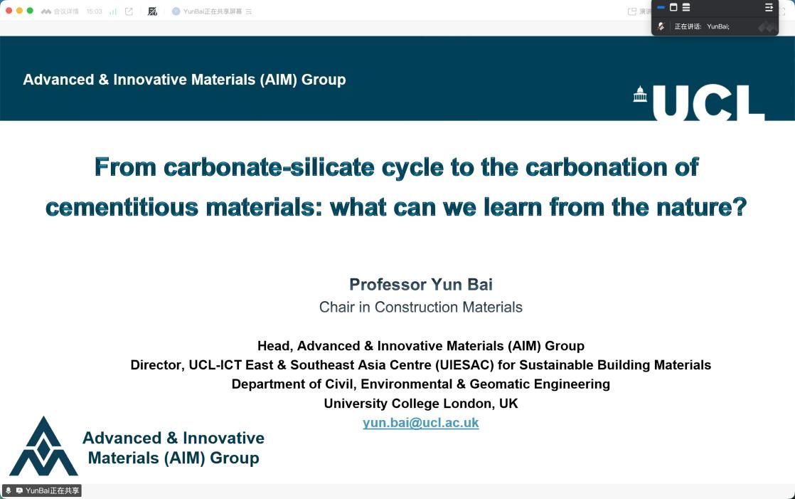 师生做《From carbonate-silicate cycle to the carbonaton of cementitious materials: what can we learn from the nature?》的线上学术报告,主要介绍全球气候变化背景下,通过硅酸盐矿物风化吸收CO2,最终形成碳酸盐岩沉积,实现碳的长期封存的技术方法,并给出相关案例,揭示出人与自然和谐相处的深刻哲理,引起参会师生的广泛共鸣。