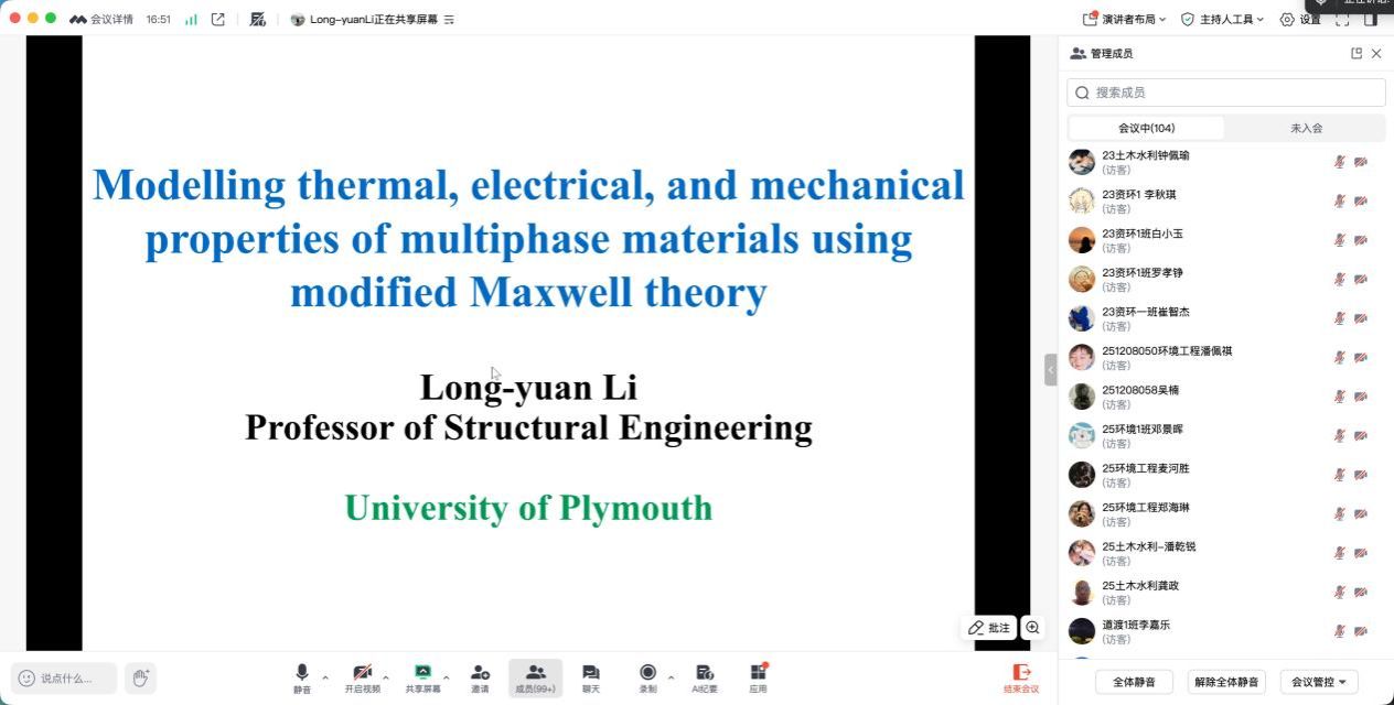 师生做了《Modelling Thermal, Electrical, and Mechanical Properties of Multiphase Materials Using a Modified Maxwell Theory》的线上学术报告,主要介绍提出的一种修正版的麦克斯韦理论,通过将渗流阈值引入预测公式,实现了上下限的统一表述,该方法可有效用于预测再生骨料混凝土的弹性模量、钢纤维增强混凝土的热导率与电导率以及碳纳米管增强复合传感器的电导率等计算,并与参会的师生就相关问题进行了讨论。