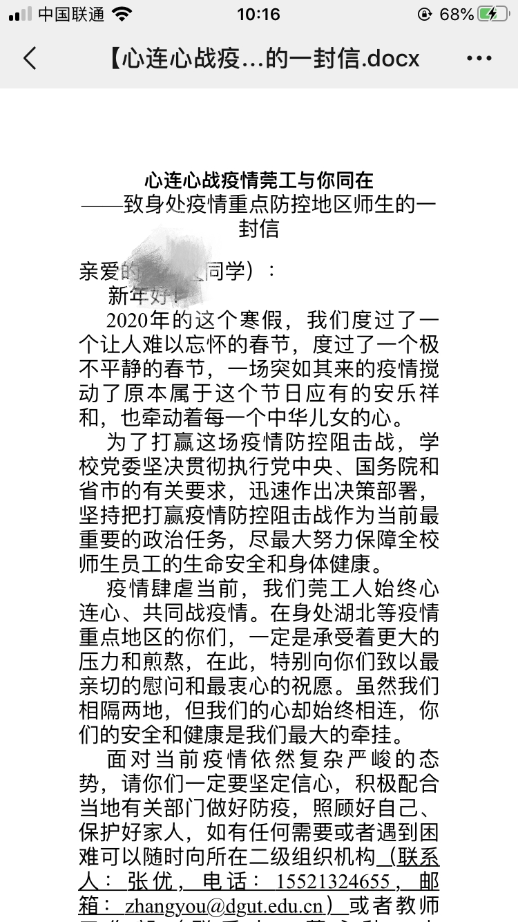 学院党政向湖北籍师生发出的温暖书信