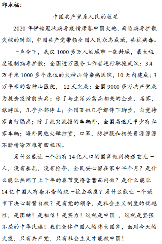 通过开展这次主题党日活动,每一个党员同志都认识到了疫情的严重性,每一个党员都立志以身作则,为全国抗击疫情工作做先行者,为战疫情做到:关注官方信息,不信谣传谣,听党指挥,服从安排。为战疫情做先锋,尽党员义务。