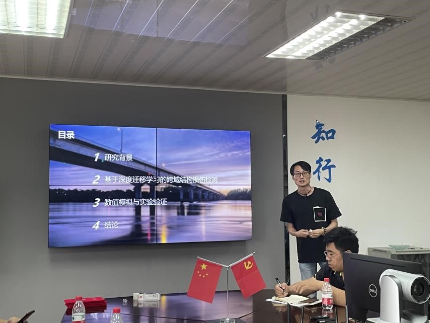 林逸洲博士后做了题为“从数值模型到真实结构:基于迁移学习的跨域结构损伤检测”的主题报告。报告针对结构健康监测领域中数值模型与真实结构之间的差距,提出了一种基于域适应深层神经网络的跨域结构损伤检测方法,同时也设计了实验室试验用来验证方法的有效性。