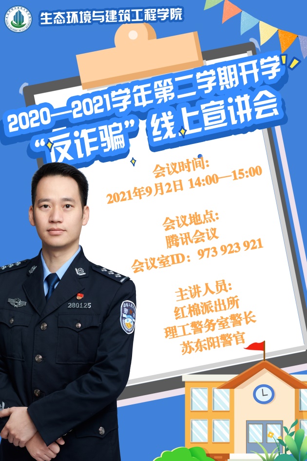 于9月2日14:00召开新学期开学“反诈骗”线上宣讲会。学院邀请红棉派出所理工警务室警长苏东阳警官为广大学生讲授有关防诈骗知识,提升学生们的防诈骗能力。