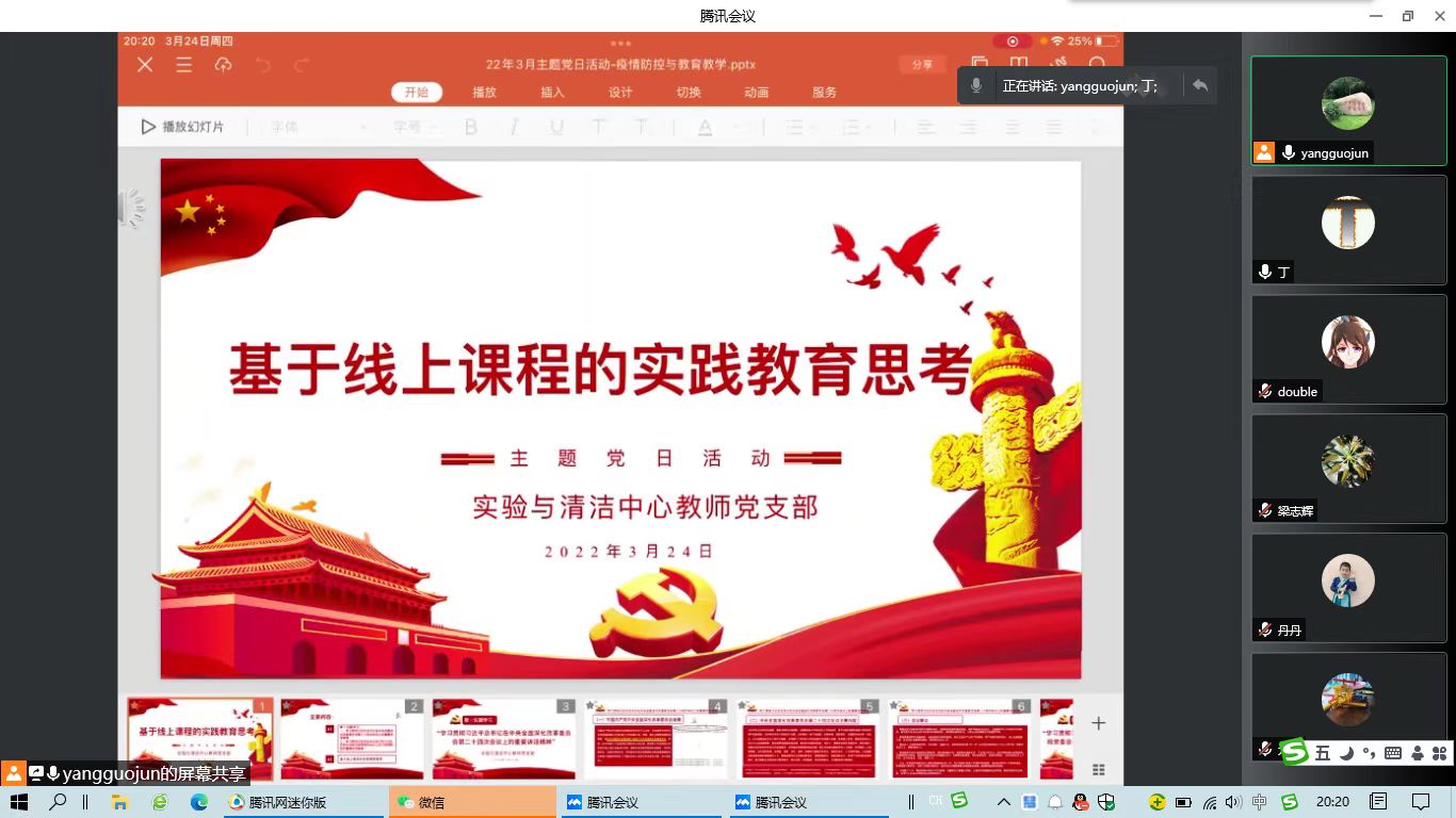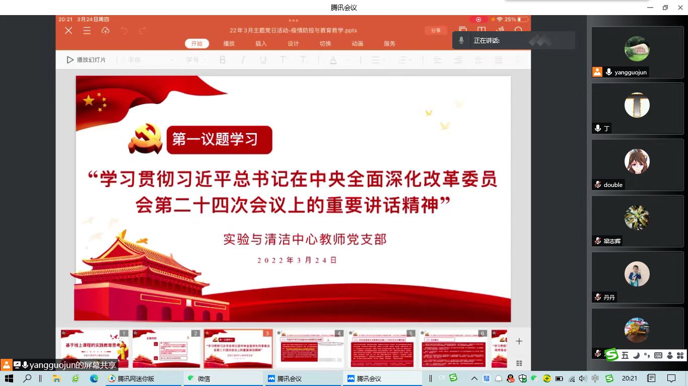 实验与清洁中心教师党支部组织开展主题党日活动,深入学习贯彻习近平总书记在中央全面深化改革委员会第二十四次会议上的重要讲话精神和习近平总书记在3月17日召开的中央政治局常委会会议上关于疫情防控的重要讲话精神,重点围绕学校第六次教育教学大讨论主题,开展“基于线上教学的实践教育思考”的集中讨论。