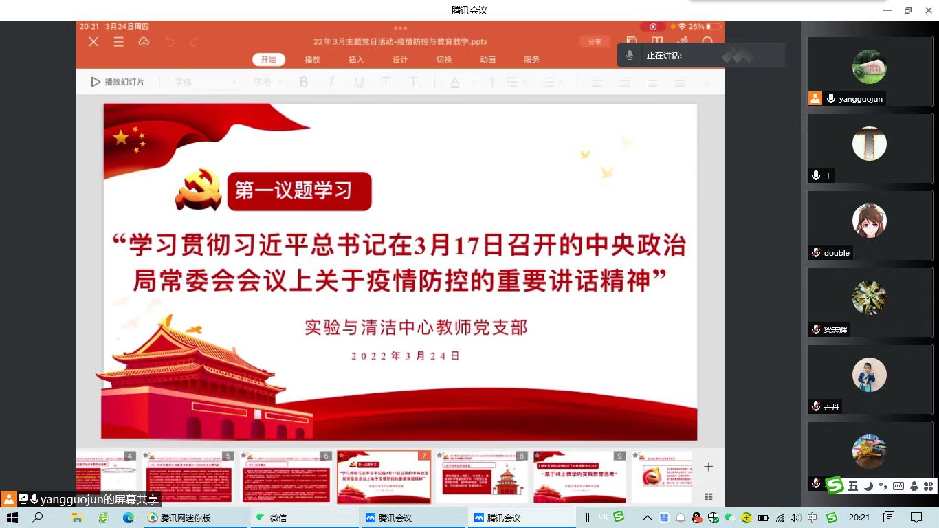 会议采用线上形式开展。党支部书记杨国军主持活动,实验与清洁中心教师党支部全体党员参加会议。