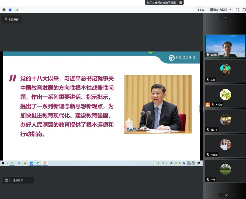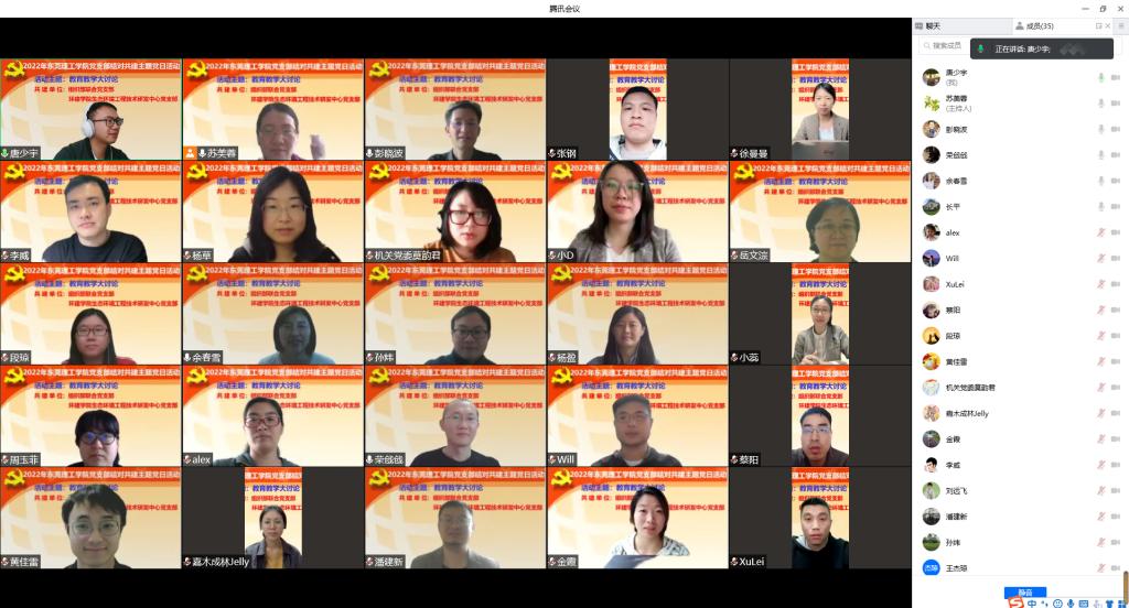 深化课程思政建设实施方案》、《关于开展“深化课堂教学改革 提升课程育人质量”教育教学大讨论的通知》精神,提高人才培养质量,3月25日,生态中心(以下简称“中心”)党支部通过与党委组织部联合党支部结对共建,在腾讯会议平台组织了主题为“研究生培养的思政探讨——春风化雨”的线上主题党日活动。本次活动由党委组织部联合党支部书记彭晓波同志主持,共分为四个部分:一是“第一议题”学习;二是党委组织部联合党支部谈对教育教学大讨论的理解和对中心党支部的希望;三是中心党支部结合工作实际,谈对研究生培养思政工作的理解;四是会议总结。中心22名党员和3名拟发展人员以及党委组织部联合党支部10名党员到会参加。