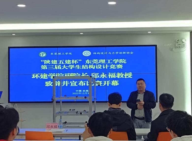 副院长邱永福教授为比赛致开幕词。邱教授从结构设计、软件计算、手工制作、沟通表达、团结协作等多个方面解读了结构设计竞赛的意义,并希望广大参赛同学们能通过这项比赛,全方位提升自身的专业能力和素养。致词结束后邱教授宣布竞赛正式开幕!