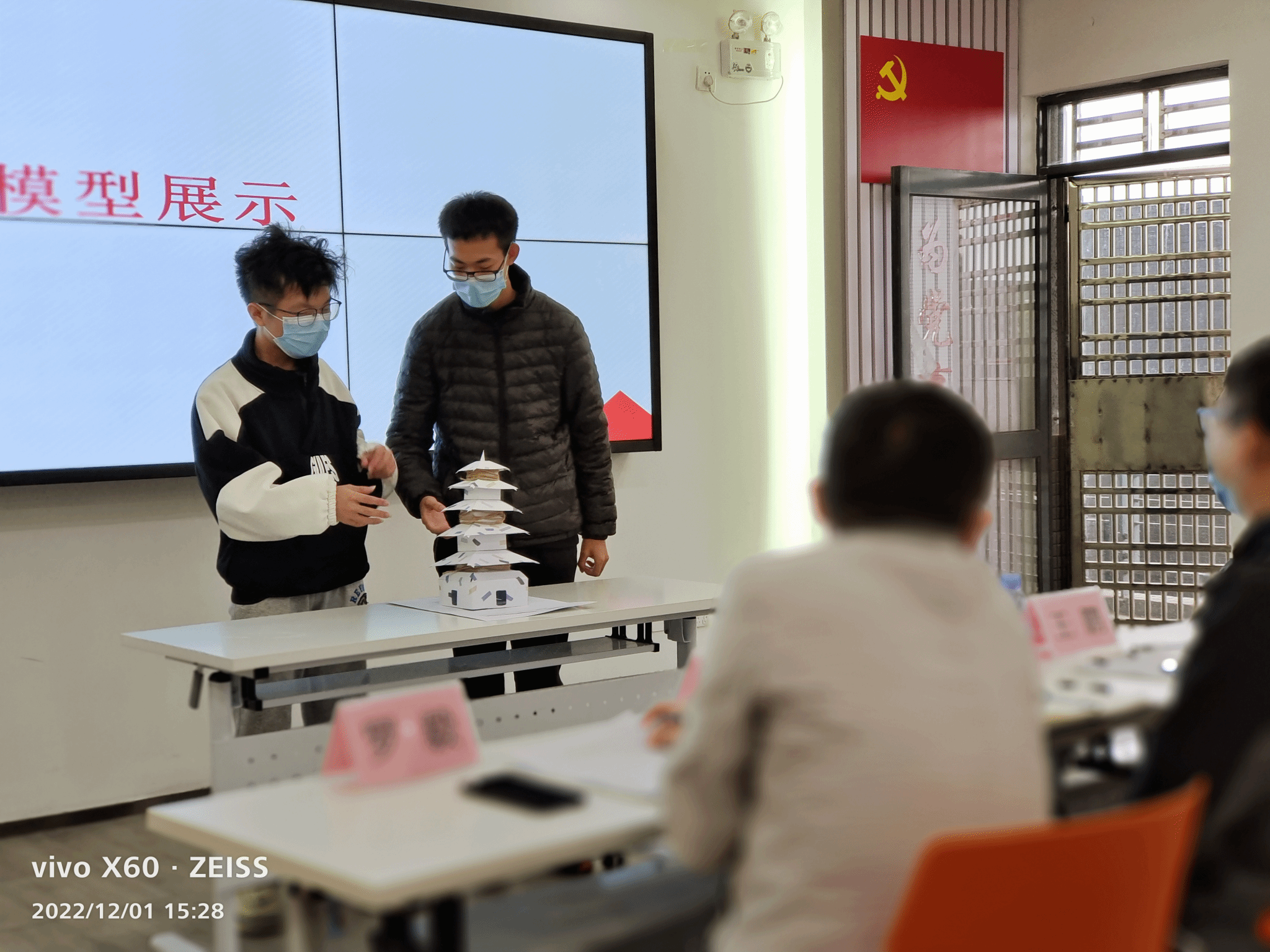 比赛过程中,在主持人的引导下第一批次各组参赛队员带着模型登台答辩。首先由各组介绍模型设计与制作的初衷与想法,接着由评委老师结合模型特点与参赛队员进行提问交流。在介绍环节全场静默,专心聆听各组制作模型时的初衷与想法;而在答辩环节,参赛同学与评委老师围绕模型设计和制作要点,展开了积极充分的讨论。不少同学表示在答辩过程中学到了许多结构设计方面的知识,这是一个很新奇很快乐的体验。