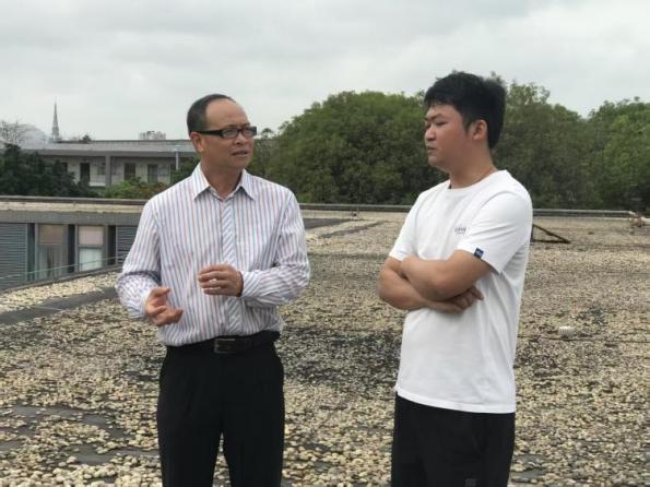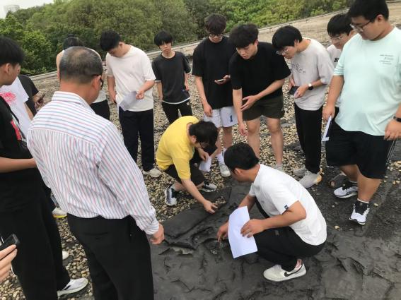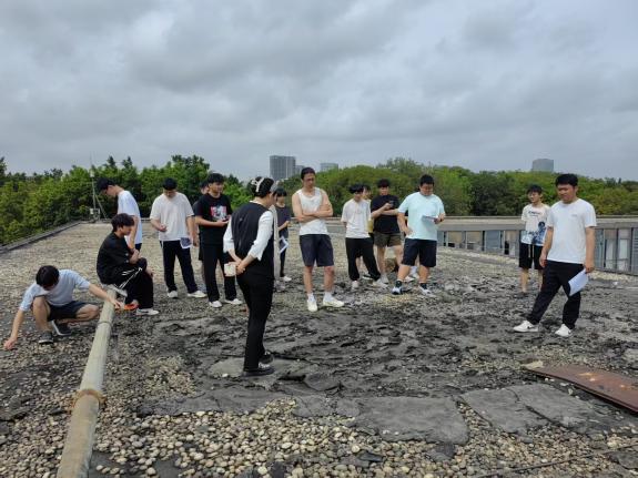 蔡育新老师说我们工程管理人员为了摸清工程项目的实际情况,要能“上天入地”。同学们在保障安全的前提下随着谢桂贤老师来到文科楼的屋面。在屋面,同学们见识到平时难得一见的屋面防水质量问题,仔细观察防水卷材老化开裂、鼓起松动及排水口堵塞等问题。谢桂贤老师与蔡育新老师分别讲解了局部修缮与整体改造的适用场景、特点及二者关系,提出既有建筑问题需综合分析,结合周边环境与建筑本身的问题,采用防排结合的方法寻求整体性的综合解决方案,强调同学们要培养建筑全寿命周期管理理念,以及环境与建筑的系统性工程思维。